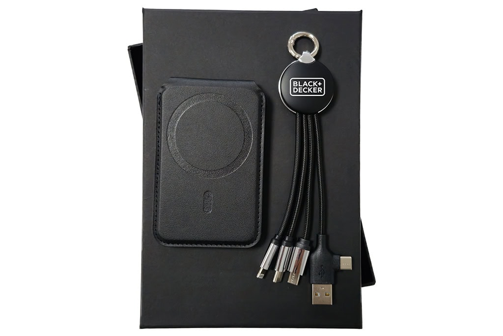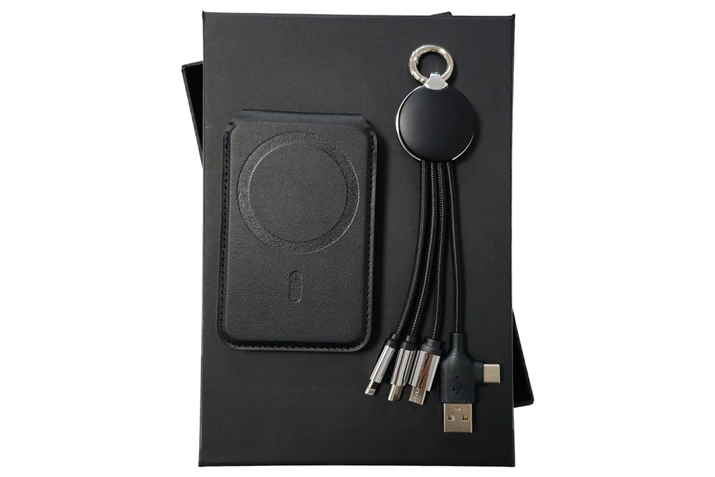 This corporate tech gift set features two phone-focused accessories: a phone wallet and a multi-charging cable. Both are used daily in the office or on the go, making them effective promotional items. With your logo applied, the set ensures continuous brand exposure while offering practical value. Presented in a branded box, it makes a smart and memorable corporate gift.